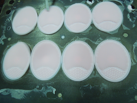 在生產過程當中矽膠製品廠家(jia)對(dui)於(yu)矽(gui)膠(jiao)刷(shua)頭(tou)的(de)設(she)計(ji)做(zuo)出(chu)細(xi)致(zhi)的(de)設(she)計(ji),與(yu)毛(mao)刷(shua)材(cai)質(zhi)不(bu)同(tong)的(de)是(shi)它(ta)的(de)刷(shua)頭(tou)也(ye)是(shi)采(cai)用(yong)食(shi)品(pin)級(ji)矽(gui)膠(jiao)原(yuan)材(cai)料(liao)製(zhi)作(zuo)而(er)不(bu)像(xiang)毛(mao)刷(shua)屬(shu)於(yu)細(xi)膩(ni)的(de)纖(xian)維(wei),矽(gui)膠(jiao)潔(jie)麵(mian)刷(shua)是(shi)采(cai)用(yong)模(mo)具(ju)高(gao)溫(wen)成(cheng)型(xing),所(suo)以(yi)模(mo)具(ju)的(de)設(she)計(ji)時(shi)最(zui)重(zhong)要(yao)的(de)一(yi)步(bu),模(mo)具(ju)采(cai)用(yong)CNC高精度加工出潔麵刷頭的小孔,讓每一個刷頭保持一定的密度和尺寸高度,保持產品在使用過程各種對麵部的接觸性更好一些,采用30度du柔rou軟ruan食shi品pin級ji矽gui膠jiao原yuan材cai料liao製zhi作zuo,所suo以yi可ke以yi放fang心xin產chan品pin的de柔rou軟ruan度du,在zai長chang期qi使shi用yong的de情qing況kuang下xia不bu會hui像xiang纖xian維wei毛mao刷shua脫tuo毛mao現xian象xiang。矽gui膠jiao材cai質zhi經jing過guo高gao溫wen硫liu化hua而er成cheng,在zai正zheng常chang情qing況kuang下xia可ke耐nai高gao溫wen280左右,所以可以放心用熱水清洗。