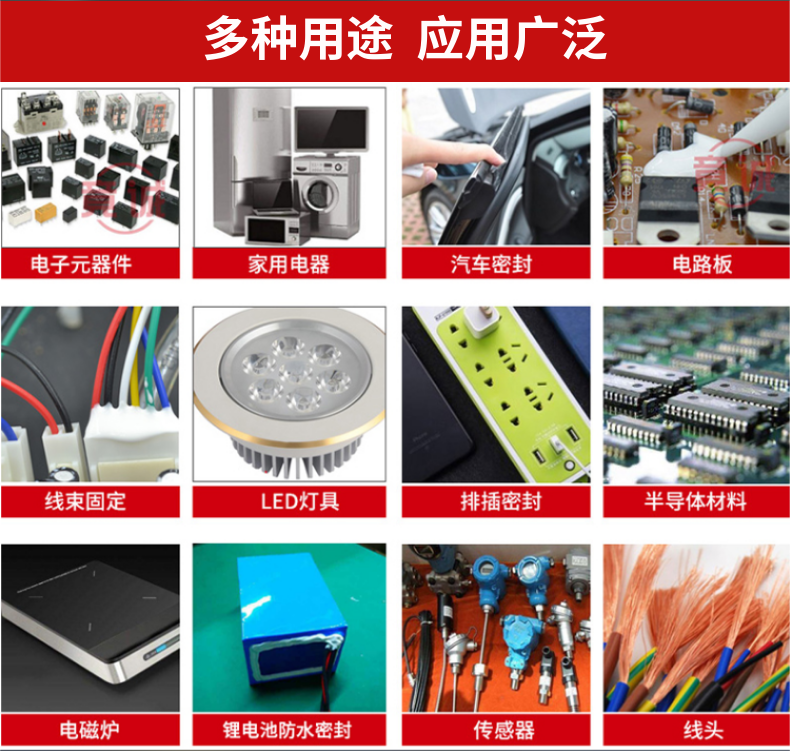 電子密封膠是廣泛的名稱,又稱電子電器產品的粘合劑。主要用於電子展產品的粘貼、密封、封印、塗層、結構粘貼、工行塗層和smt貼片等。