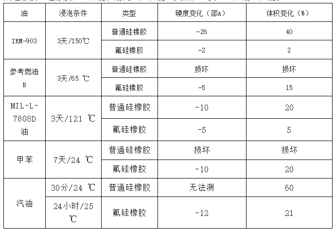氟矽橡膠與普通矽橡膠比較,氟矽橡膠與矽橡膠加工性能、耐高低溫性能均類似,主要差別是耐油性能,上麵明顯可見在經過不同參數的對比後,普通矽膠材質不論在硬度還是形狀的都有一定的差異。