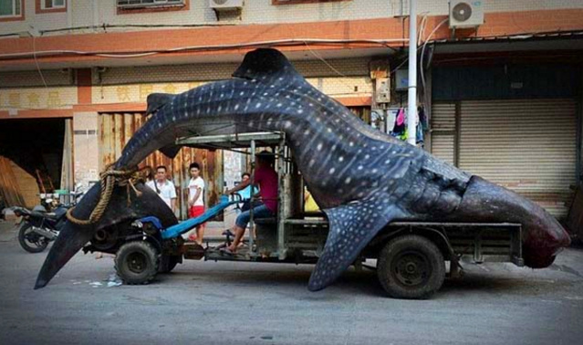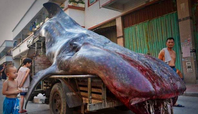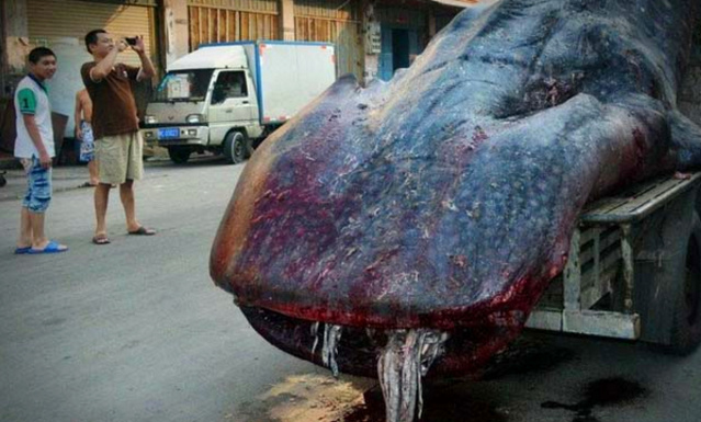 隨(sui)著(zhe)拍(pai)攝(she)者(zhe)的(de)鏡(jing)頭(tou)和(he)圖(tu)片(pian)你(ni)可(ke)以(yi)看(kan)到(dao)這(zhe)個(ge)龐(pang)然(ran)大(da)物(wu)明(ming)顯(xian)是(shi)一(yi)個(ge)深(shen)海(hai)裏(li)的(de)動(dong)物(wu),走(zou)近(jin)才(cai)發(fa)現(xian)原(yuan)材(cai)料(liao)是(shi)一(yi)頭(tou)鯨(jing)魚(yu),這(zhe)個(ge)大(da)個(ge)兒(er)被(bei)放(fang)在(zai)車(che)上(shang),嘴(zui)巴(ba)裸(luo)露(lu)著(zhe)鮮(xian)血(xue),明(ming)顯(xian)能(neng)感(gan)覺(jiao)得(de)出(chu)已(yi)經(jing)死(si)了(le)。