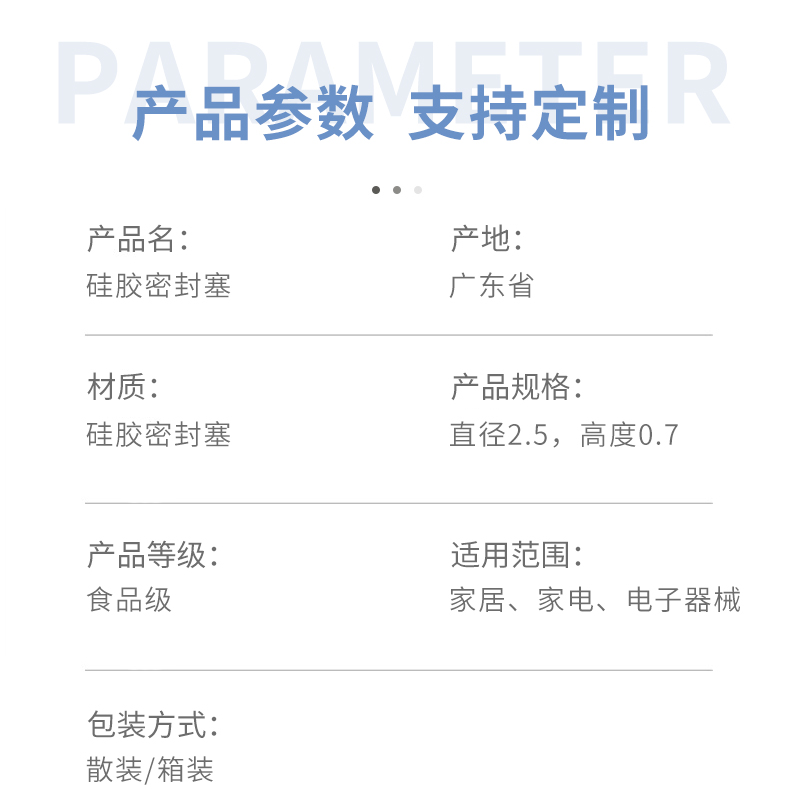 矽膠密封塞主要用於電子電器密封行業領域,在矽膠製品廠(chang)家(jia)可(ke)根(gen)據(ju)客(ke)戶(hu)要(yao)求(qiu)進(jin)行(xing)定(ding)製(zhi)設(she)計(ji),產(chan)品(pin)在(zai)定(ding)製(zhi)前(qian)期(qi)根(gen)據(ju)裝(zhuang)配(pei)部(bu)件(jian)的(de)尺(chi)寸(cun)與(yu)結(jie)構(gou)進(jin)行(xing)確(que)認(ren),需(xu)要(yao)注(zhu)在(zai)裝(zhuang)配(pei)後(hou)的(de)鬆(song)緊(jin)度(du)以(yi)及(ji)密(mi)封(feng)程(cheng)度(du)上(shang)進(jin)行(xing)調(tiao)整(zheng)結(jie)構(gou),結(jie)構(gou)確(que)認(ren)後(hou)進(jin)行(xing)模(mo)具(ju)設(she)計(ji),分(fen)模(mo)線(xian)是(shi)開(kai)模(mo)的(de)基(ji)礎(chu),確(que)保(bao)模(mo)具(ju)的(de)分(fen)型(xing)線(xian)不(bu)影(ying)響(xiang)密(mi)封(feng)防(fang)水(shui)以(yi)及(ji)功(gong)能(neng)性(xing)後(hou)可(ke)進(jin)行(xing)生(sheng)產(chan)加(jia)工(gong),在(zai)加(jia)工(gong)過(guo)程(cheng)中(zhong)可(ke)根(gen)據(ju)客(ke)戶(hu)的(de)需(xu)求(qiu)進(jin)行(xing)顏(yan)色(se)與(yu)硬(ying)度(du)的(de)調(tiao)配(pei),確(que)保(bao)後(hou)續(xu)的(de)裝(zhuang)配(pei)不(bu)會(hui)產(chan)生(sheng)功(gong)能(neng)性(xing)影(ying)響(xiang)!
