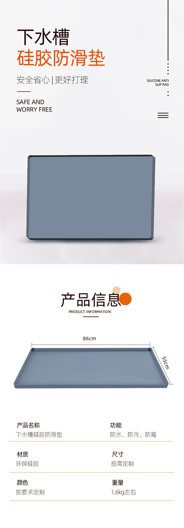 【產品功能】:廚衛防滑防水功能,可用於家庭廚衛下水槽防水,物品存放,產品防滑等功能